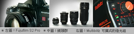 燈光方面德國相當專業的 Sachtler固定燈光組,及 Multiblitz  可攜式的燈光組;照相機我們採用了Fujufilm S2 Pro 、Fujufilm S3 Pro 、Nikon D 700 像素可達一千二百萬的專業數位相機。